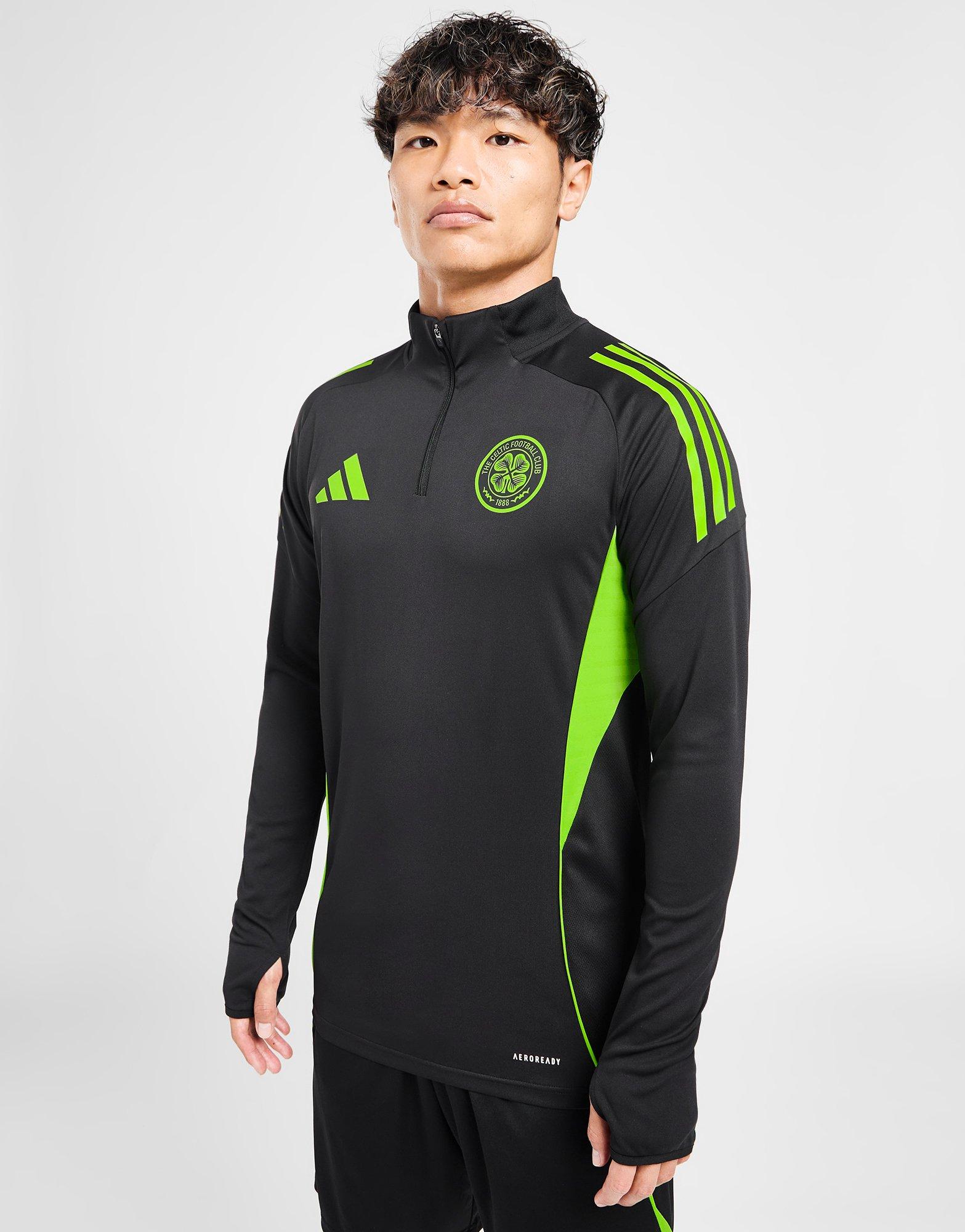 Take your skills up a level and show who you're backing. This men's Celtic Training Track Top by adidas ticks all the boxes. Lightweight, breathable, dynamic. Made to move with you, it's engineered with sweat-wicking AEROREADY tech, while mesh details keep things cool. Add extra airflow with the quarter zip collar. Finished with Semi Solar Green adidas branding, and the iconic Celtic crest. Machine washable. | JN8926