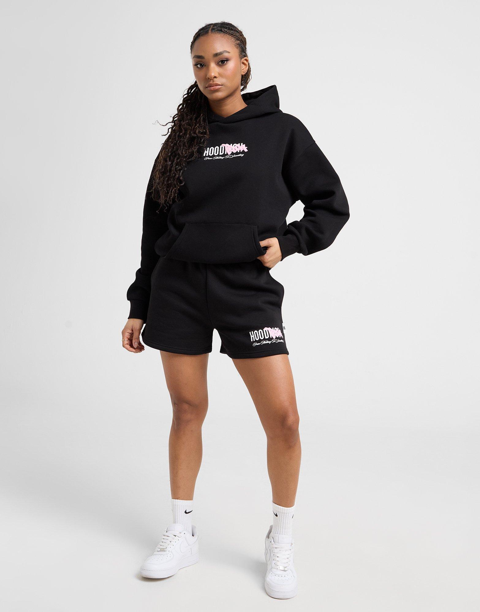 Exclusive to JD. When the sun hits, keep it casual with these women's Urban Shorts from Hoodrich. In a Black colourway, these regular-fit shorts are cut from soft brushback fleece fabric for a comfy feel. They feature a drawcord-adjustable waistband and open hand side pockets. Finished off with a puff print Hoodrich logo to the left thigh. Machine washable. | Our model is 5'7" and wears a size S.