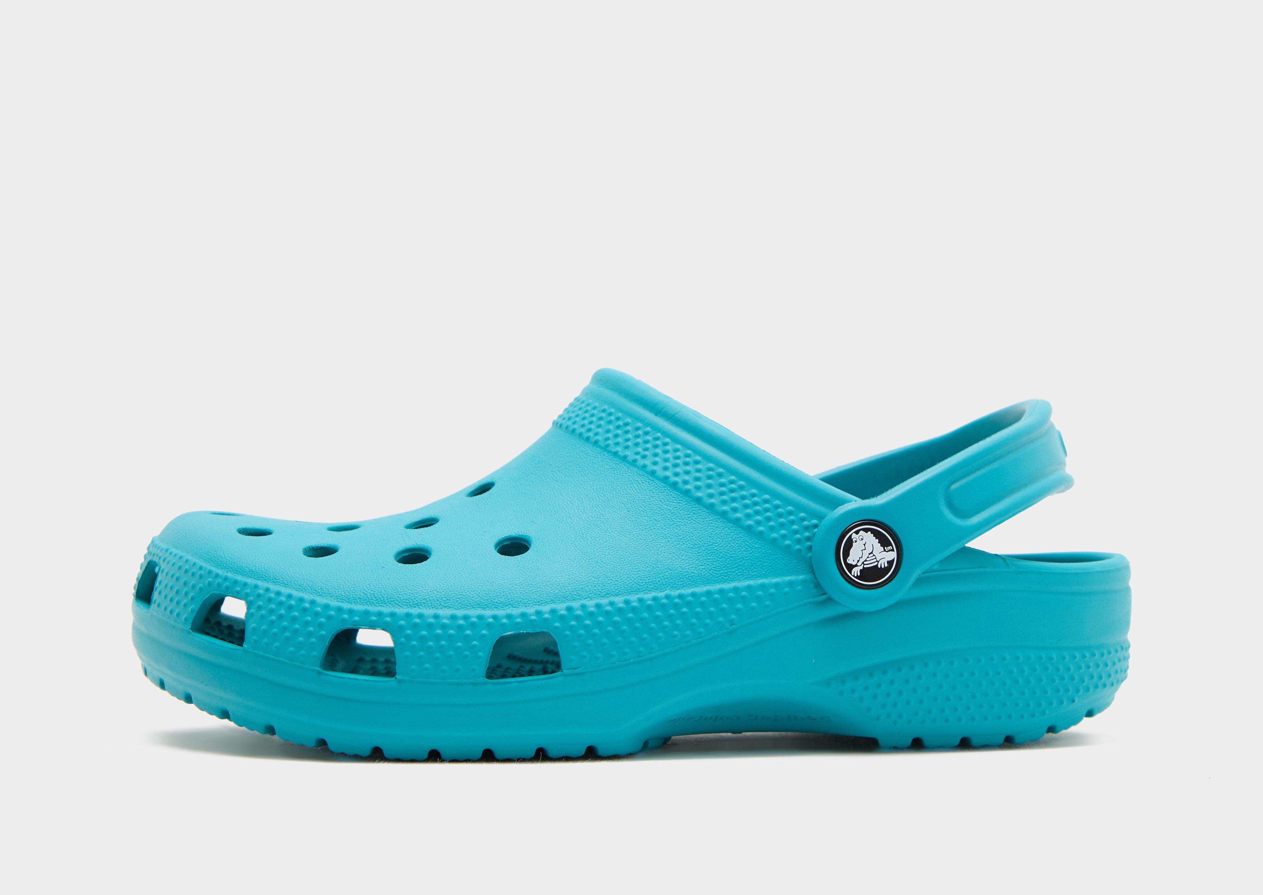 Kicking back? Crocs has got you with these juniors' Classic Clogs. In Turbo Teal, they're cut from light, water-friendly Croslite foam. They've got breathable ports to keep things cool. A pivoting heel strap to adjust the fit. And a rubber outsole for grippy traction. Crocs branding finishes things up. Please note: Crocs fit wide. If you have narrow feet, we recommend that you size down. Crocs come with the US size embossed to the sole.