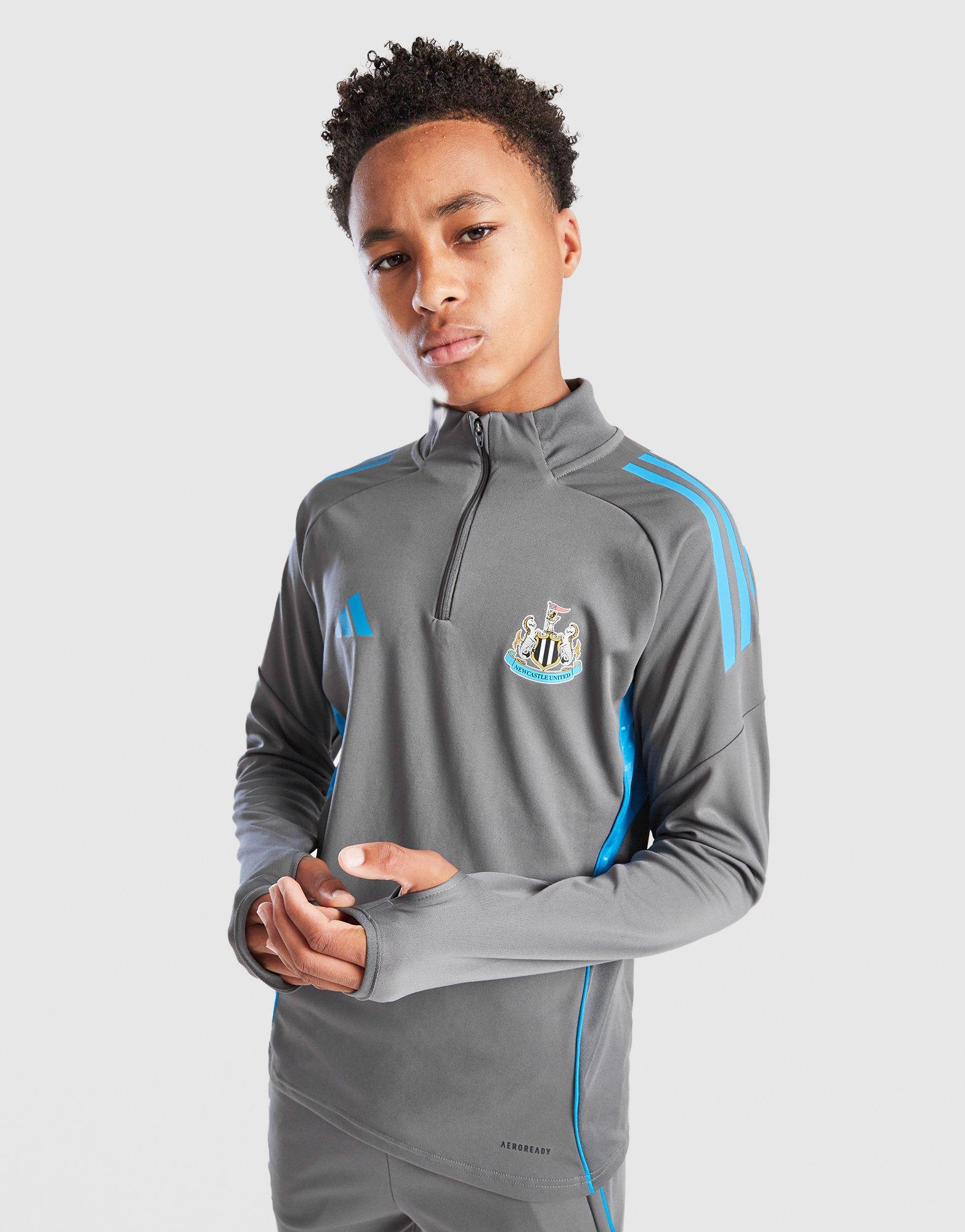 Gear up for matches in this juniors' Newcastle United FC Training Track Top from adidas. In a Grey colourway, this track top is made with smooth, lightweight recycled polyester for lasting comfort. AEROREADY tech wicks away sweat, while mesh panels keep you cool. It has a quarter zip fastening with a raised collar, and thumb loops for a secure, streamlined fit. Finished with iconic adidas branding and the Newcastle United club crest. Machine washable. | KB9821