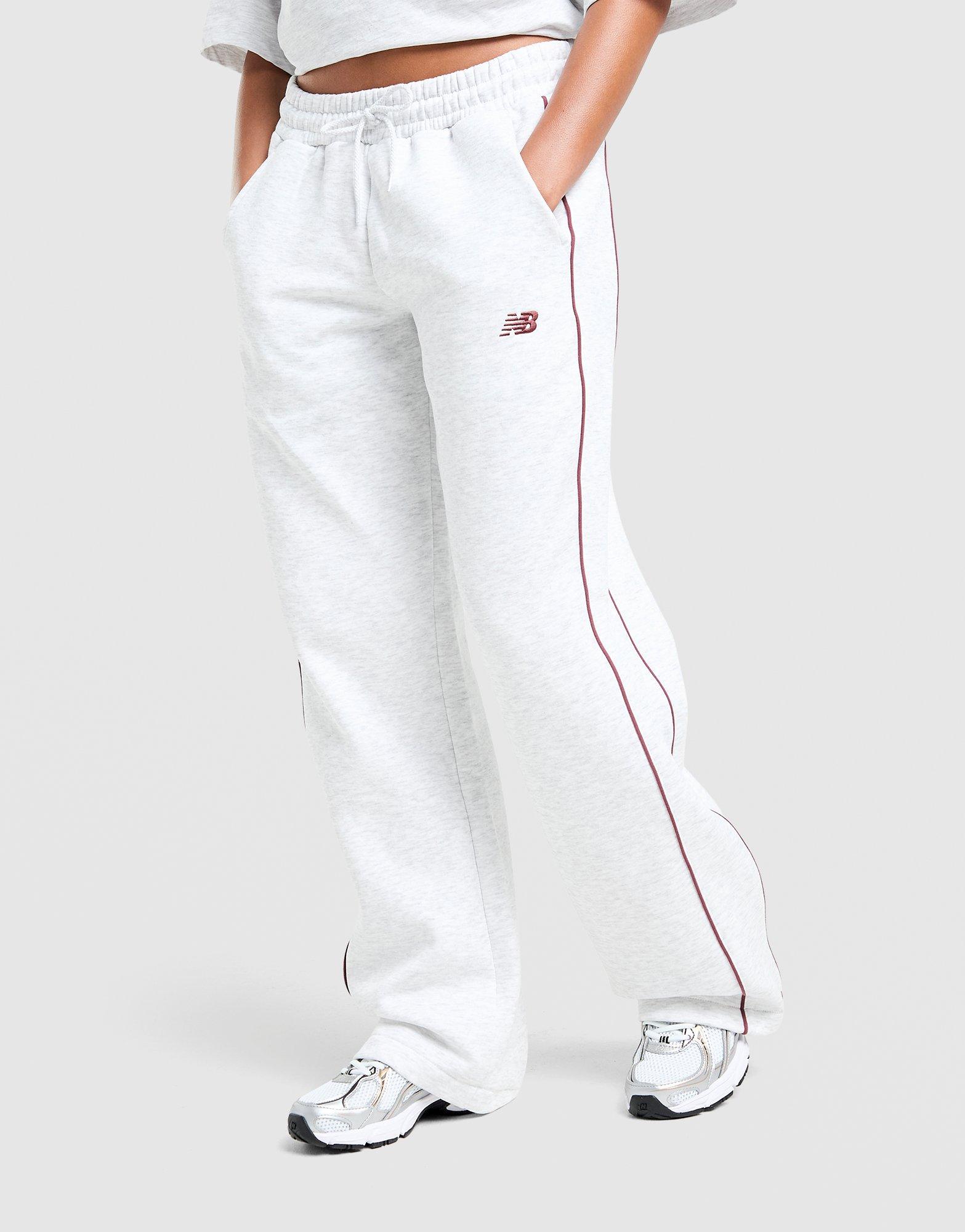 Keep it lowkey in these women's Pipe Wide Leg Joggers from New Balance. Cut from soft grey fleee, these sweatpants are smooth on the outside, fuzzy inside. They've got an elastic waistband with a drawstring, and loose, wide-fit legs for a laidback look. With open pockets to the sides, they're finished up with burgundy pipe detailing and signature NB branding. Machine washable. | Our model is 5'6" and wears a size S.
