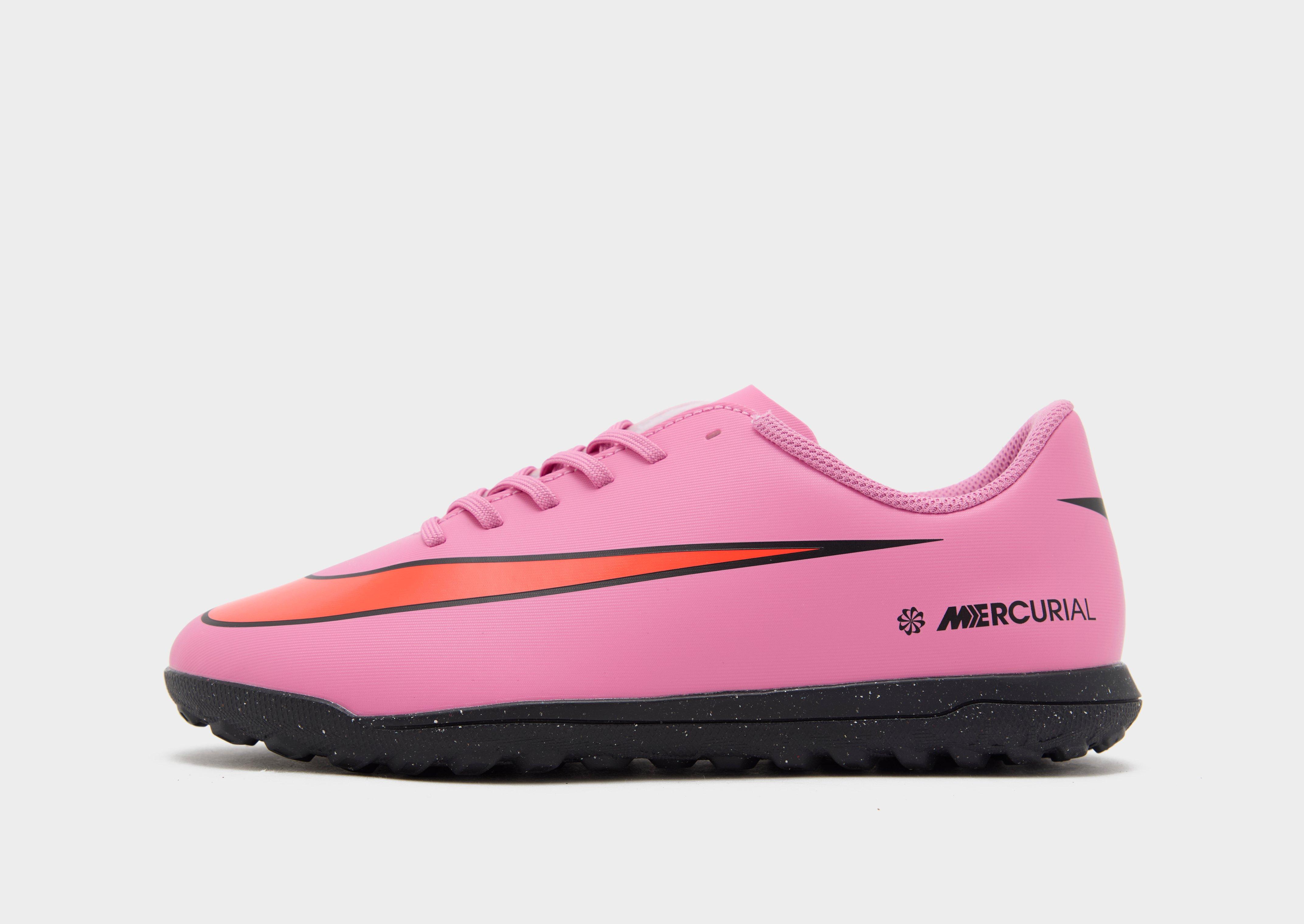 Made for speed. These juniors' Mercurial Vapor 16 Club TF football boots land in Magic Flamingo. Up top, synthetic leather has small textured details for grippy ball control. They've got a cushioned insole for added comfort. A rubber outsole for total traction on the turf. And Nike branding to sign off.