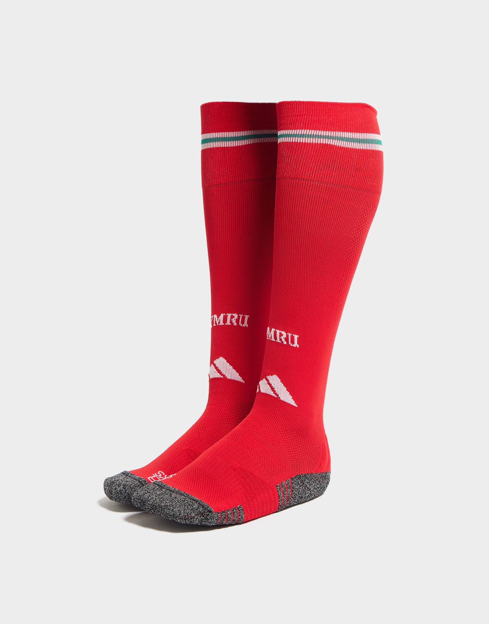 Back the Dragons on the pitch. These juniors' Wales 2026 Home Socks from adidas are cut from light, stretchy fabric. Landing in Better Scarlet, they're finished with a Performance logo and a Wales crest. Machine washable. | JM1278