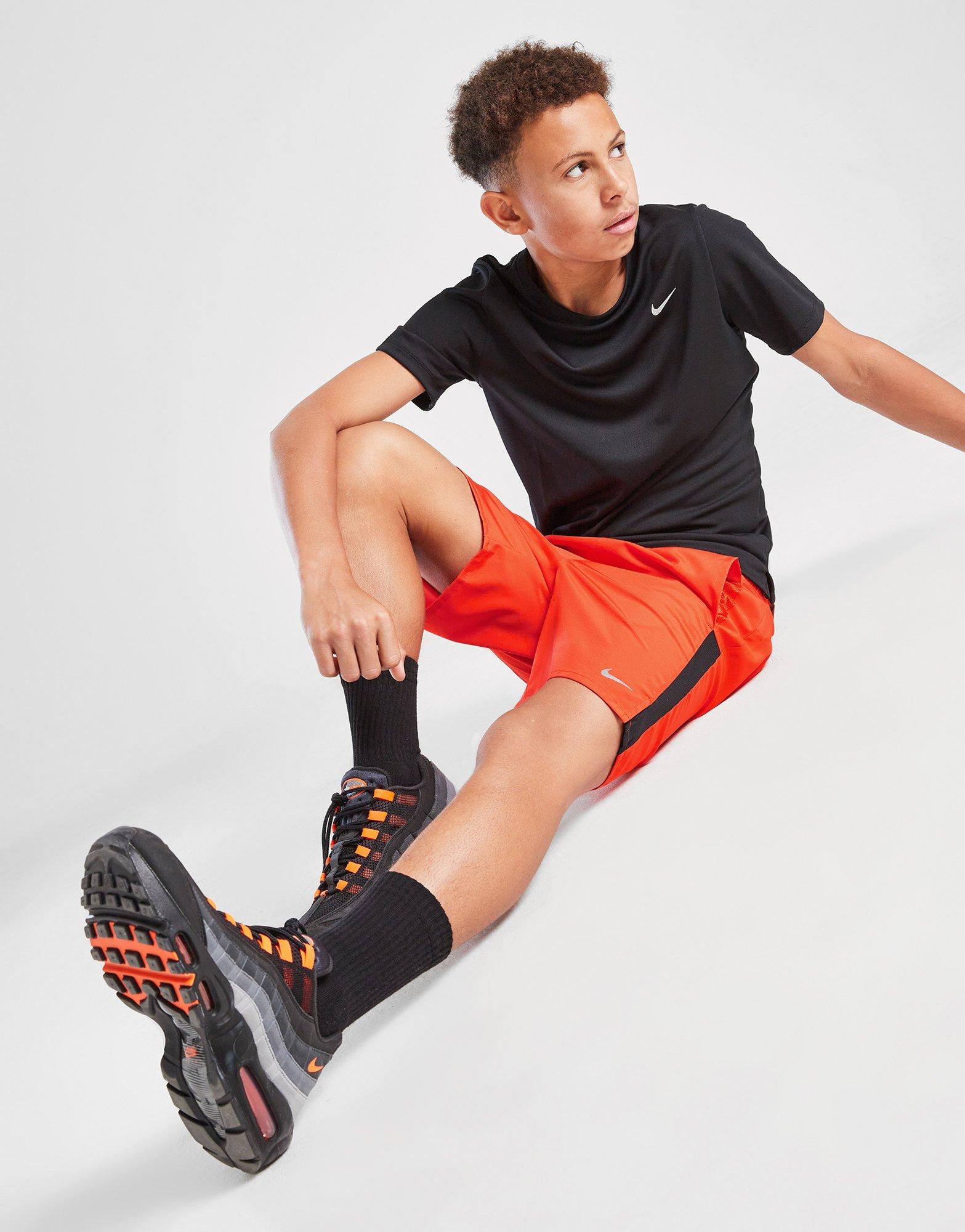 Big training ahead? No sweat. These juniors' Challenger Shorts from Nike delivery every time. In a Picante Red colourway, the lightweight woven fabric has Black mesh side panels and hem slits to keep you cool. Dri-FIT tech removes sweat, while a drop-in back pocket holds your phone. Featuring an elastic waistband with a drawcord tie, they're finished off with a reflective Swoosh logo. Machine washable.