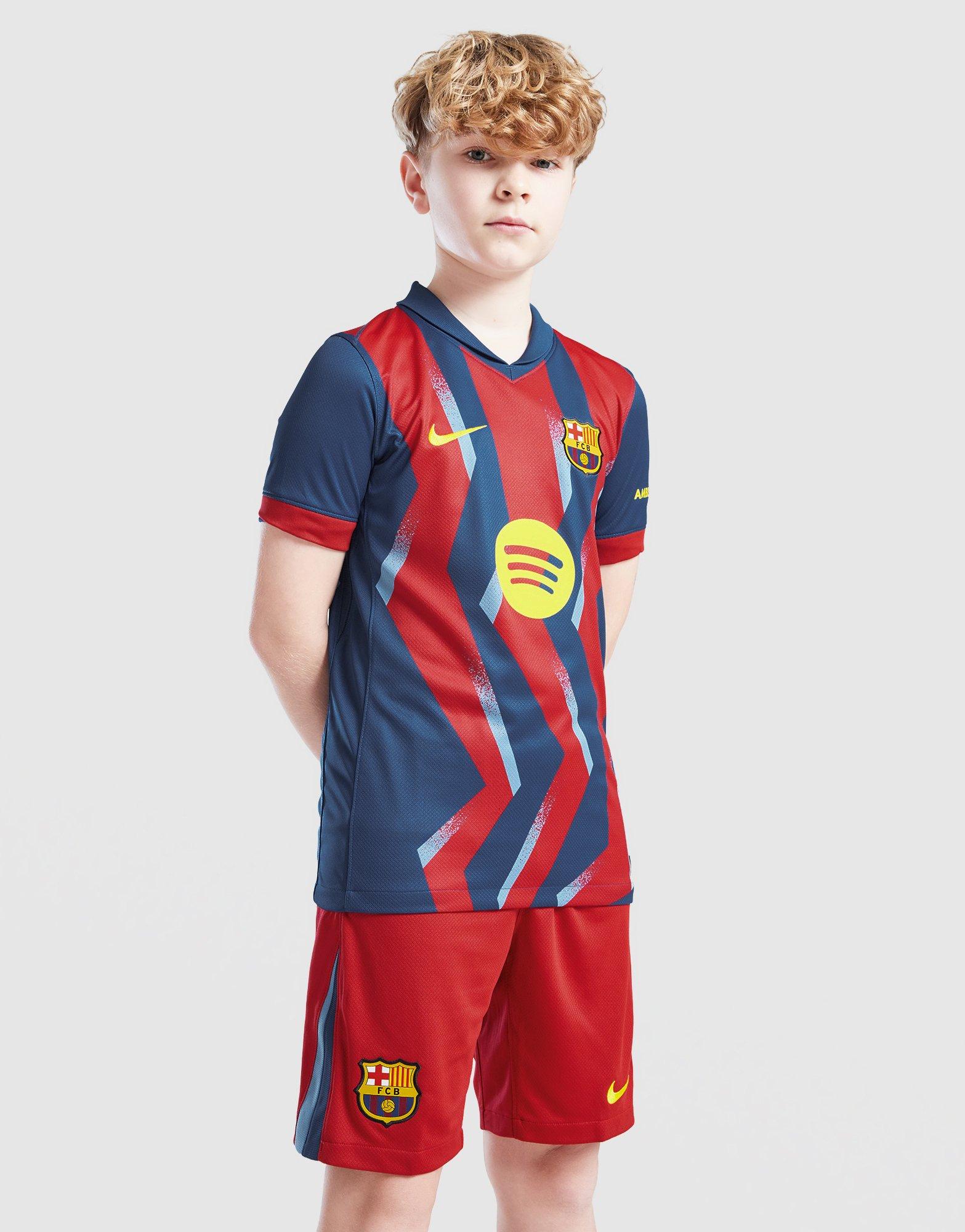 Rep the famous badge with these juniors' FC Barcelona 2025/26 Fourth Shorts from Nike. Salsa Red fabric is light and sweat-wicking. And a drawcord tie secures the waistband in place. Featuring Gym Blue and University Blue accents, these shorts are finished with a bold Swoosh and the Barca crest. Machine washable.